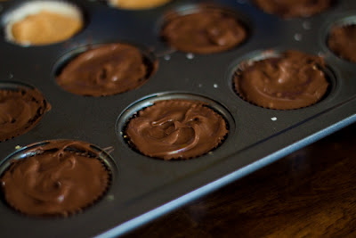 Step 9. Take the chocolate cups out of the fridge and fill each one with about 1 tsp of peanut butter filling.